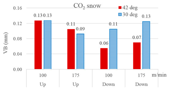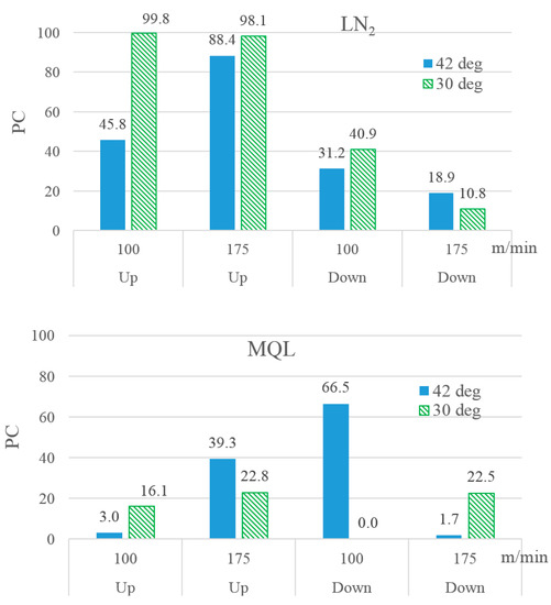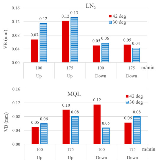 ANOVA was performed on the data shown in Figure 4. The analysis revealed milling orientation as the most influential factor regarding VB, followed by the choice of cutting fluid. The interaction between milling orientation and cutting fluid stood third in terms of statistical significance, followed by the solitary effects of cutting speed and cutter’s helix angle. The strong interactive effect between milling orientation and cutting fluid on tool wear is evident from the three plots of Figure 4 in the manifestation that down-milling yielded vastly lower tool wear than up-milling only when the applied cutting fluid was liquid nitrogen. Shokrani et al. claimed that the coated carbide cutter used for cryogenic (LN2) milling of Ti-6Al-4V, operated at 200 m/min cutting speed and 0.03 mm/tooth feed rate, showed the minimum level of flank wear [14]. The current work, on the other hand, found MQL to be a better cutting fluid than the cryogenic fluids with respect to tool damage. The finding was based on milling performed at a slightly lower cutting speed but an enormously larger feed rate.