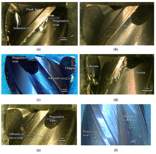 Figure 5 presents the microscopic images of the selected used cutters. The six cutters were selected so as to ensure a maximum level of diversity regarding the predictor variables. The microscopic visual analysis revealed occurrence of progressive mechanical wear and adhesion of work material as the major modes of tool damage, while chipping of cutting edge was also observed in a few tools. As can be seen from Figure 5a,d, all the cutters used in the runs involving up-milling and either of the two cryogenic fluids experienced thick adhesion of work material at their cutting edges. The adhered material, in all these runs, was in the form of minute flakes. The observation tallies with the findings of the previous works. It was reported that adhesion wear was the main tool damage mechanism in LN2-assisted machining of Ti-6Al-4V [7]. In addition, up-milling was also reported to instigate more severe tool wear in the peripheral milling of a hardened steel [24].