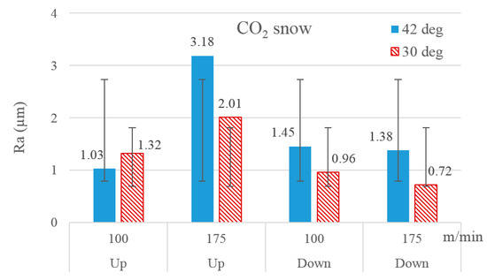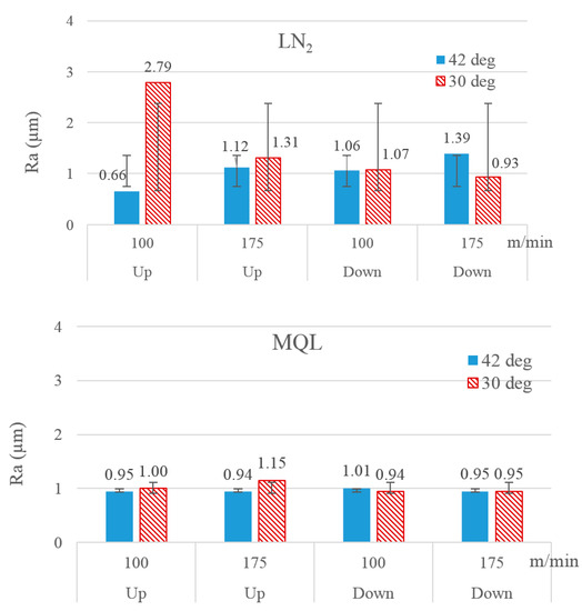 It is quite surprising to see micro-lubrication yielding better surface finish than the two cryogenic coolants. As far as a continuous machining process is concerned, many papers reported strikingly improved work surface finish caused by the use of a cryogenic coolant. On the contrary, cryogenic cooling, in this study, yielded a poor work surface quality regarding the milling process. A plausible explanation for this observation is that milling is an interrupted machining process in which cutting teeth periodically engage and disengage with the work. Each tooth engagement causes an increase in temperature of the tooth, as well as the newly generated work surface. The surface tends to expand due to the resulting increase in temperature but immediately gets impinged upon with the flow of a cryogenic fluid as the cutter clears the area following its feed. The impact of the super-cool fluid immediately lowers its temperature, pushing the surface into the contraction mode. Such an intense thermal effect instigated upon the newly generated surface, sending it into abrupt modes of expansion and contraction, causes deterioration of the surface quality. A 25% reduction in work surface roughness was reported when graphene-dispersed vegetable-oil-based micro-lubrication was applied in the milling of Ti-6Al-4V [17]. An increase in cutting speed was found to reduce the surface roughness when the milling orientation was down-milling. Its influence on Ra with up-milling is not clear. An increase in cutting speed was also reported to reduce the work surface roughness in milling of a hardened steel (AISI D2) [9].