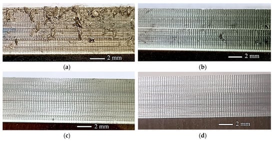 Figure 7 presents the textures of the four milled surfaces obtained after completion of the selected experimental runs. Clearly, the surfaces produced by up-milling (Figure 7a,b) were marred by the adhesion of micro-chips. The adhesion caused serious deterioration of the work surface. Figure 7a presents the roughest of all the surfaces generated in the 24 runs. All the runs employing the combination of CO2 snow and up-milling yielded severe adhesion of micro-chips on the milled surfaces. Figure 7c,d do not show any sign of adhesion, as both of them were associated with the runs employing the down-milling orientation. It is to be noted that the pattern of vertical lines on the texture was the same in all the images. This is because all the runs were carried out at a fixed value of feed per tooth. Figure 7b shows a white horizontal line running through the generated surface. The line was generated by the chipped portions of the four flutes of the cutter, which might have encountered a hard phase during the first pass of the run.