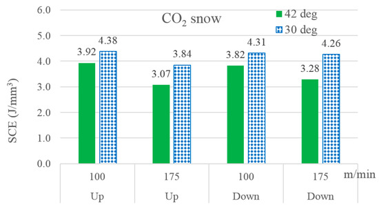 From the perspective of machining sustainability, it is often urged to include the relevant energies required to liquefy, compress, and deliver per unit mass of the cutting fluids in the SCE calculations. The authors would like to present some quantifications in this regard. For this study, the measured volumetric flow rate of LN2 as a coolant was 0.5 L/min. Furthermore, the density of nitrogen in the liquid state was equal to 804 kg/m³ at a temperature of −195.8 °C. European Industrial Gases Association (EIGA) reported that separating nitrogen at 0.1013 MPa and liquefying it from a temperature of 285 K requires consumption of electrical energy of about 549 kWh per ton of the gas [33]. Converting this figure into the power requirement against the mass flow rate of 0.402 kg/min gives 13.24 kW. Moreover, the storage dewar used in the experimental work consumes additional 50 watts of power to pump the LN2 at the given flow rate. It was reported that capture and compression of CO2 gas consumes electrical energy in the range of 250–300 kWh/ton of the gas [34]. For the average value of the reported range, 275 Wh/kg, and the mass flow rate of 0.5 kg/min, the average electric power required to supply and maintain the given flow rate of the CO2 gas is 8.25 kW. Lastly, the average power required to drive the employed MQL system at the air pressure, oil mixing rate, and air flow rate of 0.6 MPa, 30 mL/h, and 0.4 L/s, respectively, is 418 Watts. The details regarding the calculations can be seen in Reference [35]. By adding the above calculated values of power requirements, the SCE values ranged from 57.6 to 82 J/mm3, 74.5 to 131 J/mm3, and 5.2 to 8.3 J/mm3, respectively, for CO2 snow, LN2, and micro-lubrication. Clearly, the modified values of SCE rendered the comparisons among the three cutting fluids trivial, with LN2 topping the list of the tested fluids by an unprecedented margin.