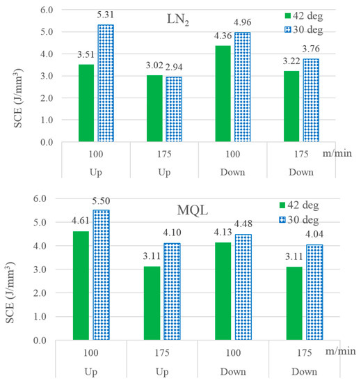 Table 2 presents the data regarding measurement of total electric power and cutting and non-cutting powers and evaluation of the SCEs for the 24 experiments. The procedure for measuring the electric powers was already detailed in sub-Section 2.3. Figure 8 presents the experimental results of the 24 runs regarding consumption of specific cutting energy. Two conclusions can be drawn directly from the plots. Firstly, the cutters with a 42° helix angle consumed less energy than those with a 30° helix angle. Secondly, the higher level of cutting speed caused a decline in energy consumption. ANOVA applied to the SCE data revealed extreme statistical influences of cutting speed and cutter’s helix angle. The effect of cutting fluid was found to be marginally significant, and that of milling orientation was found to be insignificant.