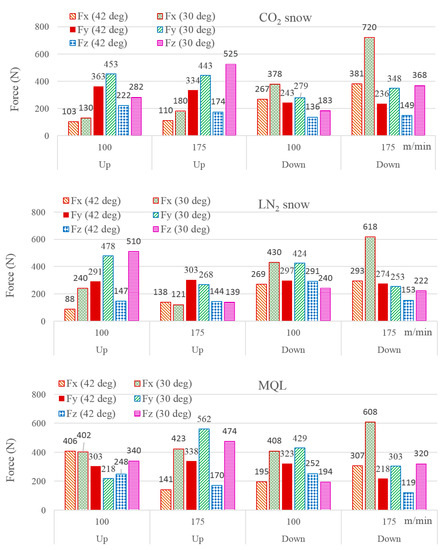 The graphs highlight a phenomenon that sets apart the cryogenic fluids from micro-lubrication. It can be seen from Figure 10a,b that the instantaneous values of the force components sharply decreased as the cutting pass progressed. The magnitudes remained fairly constant in the third graph. This is attributed to the temperature dependent variation in yield strength/flow stress of the work material. As described before, the supply of a cryogenic fluid was opened 20 s prior to the start of the first milling pass. As the cryogenic fluid was also received by the work, in addition to the tool, the surface temperature fell sharply, raising the material’s yield strength. Thereafter, as the cutting process started, the process heat raised the temperature of the work material, thereby reducing its flow stress. The fall in the work material’s flow stress is reflected by the diminution in the force components as the cutting process proceeded.