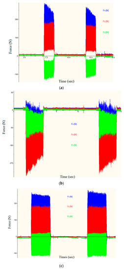 Figure 10 presents the progress of the three force components with time for the selected experimental runs. Two concentration zones are visible in each of the three graphs representing the two cutting passes per experimental run. The two zones in Figure 10a are thinner than those in the others because they represent the cutting passes conducted at the higher speed level. Based on the feed directions, the radial force components (Fx and Fy) were found in the positive and negative regions for down- and up-milling, respectively. The axial component (Fz) was located in the negative region irrespective of the milling orientation.