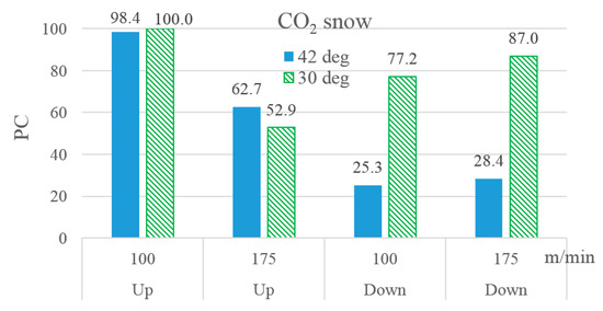 While evaluating PC for the 24 experimental runs, it was found that tooling cost was the most weighted contributing factor, followed, in descending order of weightage, by acquisition cost of cutting fluids, overhead cost, direct energy consumption cost, and equipment depreciation cost. The process cost’s estimation is shown in Figure 11. The figure clearly shows that, of the three cutting fluids tested, micro-lubrication yielded the most economical results, which is attributed to the low levels of VB and low unit cost and consumption rate of the associated cutting fluid. Of the two cryogenic coolants, CO2 snow yielded better results when milling orientation was up, while LN2 was clearly more economical for down-milling. Furthermore, a high helix angle produced better results, especially under the cryogenic cooling environments, due to the associated low levels of tool damage incurred. Lastly, the effect of cutting speed on process cost was not very clear, as this predictor asserted its effects on all five constituents of PC in different ways. With regard to a continuous cutting process, it was reported that high-speed machining of Ti-6Al-4V yielded better surface finish and caused lower consumption of specific energy than conventional machining, but fared poorly with respect to the sustainability measures of tool life and process cost [35].