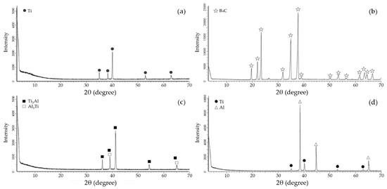 In addition to the starting materials’ characterisations, XRD analysis was accomplished—Bruker D8 Advance A25 (Billerica, MA, USA) with Cu-Kα radiation. Figure 1 shows the patterns of the powders from which the five blends were prepared. Based on the resulted diffraction spectra, the composition of the powders agreed with the suppliers’ information in the case of Ti powder, B4C and Ti-Al(1) in Figure 1a–c, respectively. In the case of Ti-Al(2), the remarked peaks corresponded to the Ti and Al elements, matching the elementary blending of Ti and Al, whose molar ratio was 1:1 (Ti:Al), as it was above-mentioned.