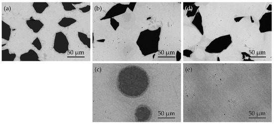 CBS-SEM (circular backscattered-scanning electron microscopies) images: (a) Ti + 30 vol. % B4C, (b) Ti + 30 vol. % B4C + 20 vol. % Ti-Al(1), (c) Ti + 20 vol. % Ti-Al(1), (d) Ti + 30 vol. % B4C + 20 vol. % Ti-Al(2) and (e) Ti + 20 vol. % Ti-Al(2).