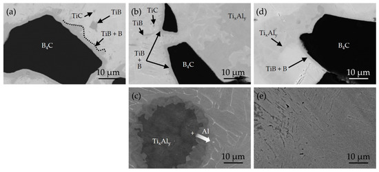 As previously mentioned, when no B4C was added, how introducing TixAly in the matrix caused differences. This can be clearly seen in Figure 3c,e. There was a reaction layer surrounding the intermetallic phases when prealloyed intermetallic was introduced as a starting powder (TiAl(1)). This reaction layer was due to the decomposition of the intermetallic being Al-incorporated into the matrix.