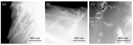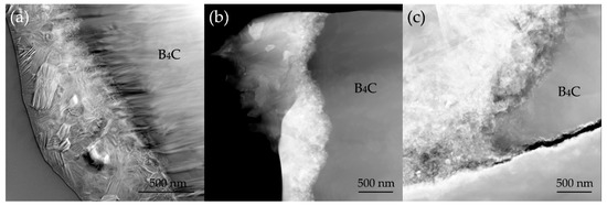 (S)TEM images 80,000x: (a) Ti + 30 vol. % B4C, (b) Ti + 30 vol. % B4C + 20 vol. % Ti-Al(1) and (c) Ti + 30 vol. % B4C + 20 vol. % Ti-Al(2).