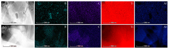 TEM images and compositional mappings: (a) Ti + 30 vol. % B4C + 20 vol. % Ti-Al(1) and (b) Ti + 30 vol. % B4C + 20 vol. % Ti-Al(2).