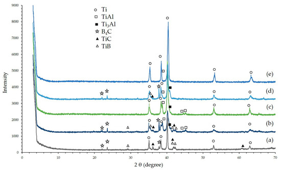When the starting blend was made without B4C, while the pattern of the specimen produced from intermetallic powder Ti-Al(1) revealed the peaks of the Ti3Al and TiAl phases (Figure 7c), the pattern of the specimens made from Ti-Al(2) powder showed mainly the displaced peaks of Ti and a small quantity of TiAl (Figure 7e). This could be due to the Al migrated into the titanium crystal lattice, avoiding the formation of TixAly phases. The presence of B4C and the secondary phases affected the Al diffusion; therefore, the peak of Ti3Al was slightly detected in specimens made from B4C and Ti-Al(2) (see Figure 7d).