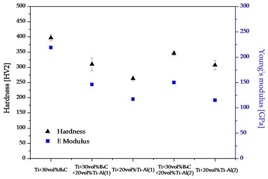 The values of hardness in the matrix and Young’s modulus are plotted in Figure 8. These results agreed with the previously commented microstructural study and XRD analysis. As it was expected, the B4C addition led to the onset of TiB and TiC becoming in an increase of the hardness and Young’s modulus. Whereas there was more evidence of the TiB and TiC precipitates in the composites made from Ti-Al(1), the hardness and Young’s modulus of these specimens were similar to the composites made from elementary Ti-Al powder (Ti-Al(2)). The Al diffusion phenomenon into the titanium crystal lattice was helping to the matrix strengthening in specimens made from Ti-Al(2). Comparing samples without B4C, the same trend was observed in the hardness and Young’s modulus values (Figure 8). Therefore, this verified how, from different starting powders and diverse reactions phenomenon, the final properties could be, to some extent, similar; other authors have reported some positive or negative effects on the mechanical behaviour of the titanium alloys with other intermetallic additions [35,36].