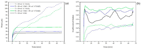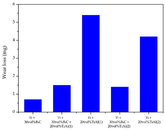 As regards the tribological behaviour, the wear resistance and the coefficient of friction (COF) were measured and evaluated (Figure 9 and Figure 10). The wear loss (mg) after sliding for 66.3 min (500 m, 400 rpm) is shown in Figure 9. This loss results differed significantly in their value due to the combination of B4C and intermetallic content. The enhancement in fretting wear with only the addition of B4C was relevant. It is important to note that the minor weight loss resulted in the TMC reinforced only with B4C. The intermetallic incorporation in the starting powder involved that the weight loss increased by 50% and 53% in composites made from B4C with Ti-Al(2) and Ti-Al(1), respectively. These phenomena were related to the amount of in situ formed TiB and TiC; if there were an obstacle to origin these secondary phases, the tribological properties could decline. Therefore, when the Al diffused into the matrix blocking these secondary reactions, there was less formation of TiB and TiC, which was reflected in the final tribological behaviour of the composites. These results were in agreement with the ones obtained by microscopy and XRD analysis.