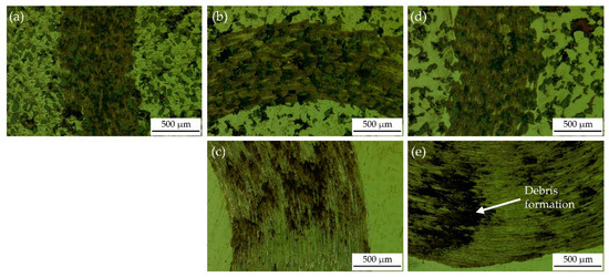 Worn surface: (a) Ti + 30 vol. % B4C, (b) Ti + 30 vol. % B4C + 20 vol. % Ti-Al(1), (c) Ti + 20 vol. % Ti-Al(1), (d) Ti + 30 vol. % B4C + 20 vol. % Ti-Al(2) and (e) Ti + 20 vol. % Ti-Al(2).
