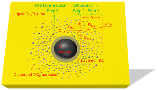 In order to simplify the reasoning process, in a previous study [], the concentration of Ti atoms at infinity relative to the carbon source particles was taken as the original concentration of Ti in the Cu-Ti melt (CTi,b). In fact, there should be a concentration transition layer of Ti atoms near the C source. Its thickness is likely to be limited relative to the diameter of the C source particles. Therefore, the thickness of this concentration transition zone is defined as “h”, as shown in Figure 1. The in situ reaction kinetic of spherical C source particles in the Cu-Ti melt was re-derived in this paper. The specific process is described below.