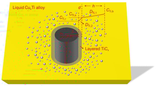 where CTi,b and CTi,s are the concentration of Ti atoms in the Cu-Ti melt and on the layered TiCx surface, respectively (mol/m3), d is the thickness of the layered TiCx (m), and h is the concentration transition layer thickness of Ti atoms in the Cu-Ti melt (m). Equation (3) is an expression for the diffusion of Ti atoms from the Cu-Ti melt to the surface of the particles enclosed by the TiCx product layer. For step (2), the solid-state diffusion of Ti atoms through the layered TiCx is