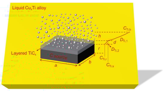 The modeling work in this study is based on the experimental phenomenon of the solid-liquid in situ reaction between graphite carbon and Cu-Ti alloy. The reaction of solid C source particles in the Cu-Ti melt is [Ti] + xC(s) = TiCx(s). This reaction can be regarded as the “dissolution” process of the solid phase in the liquid phase. It was found in the experiment that, during the reaction, a TiCx transition layer forms on the surface of the solid C source particles, which was also found in the study of Dudina et al. [] when investigating the solid-state interactions in the Ti25Cu75 + C system with different sources of carbon. For a solid C particle wrapped by solid TiCx, if the reaction interface is between the liquid alloy and the TiCx layer and the reaction is determined by the diffusion of C, then the volume of the solid C should decrease gradually, and there will be a gap between the solid particle and the layered TiCx. The above phenomenon was not detected in our previous study []; instead, the solid C particle combined closely with the solid TiCx layer. Thus, we deduced that there is a high possibility that the interface where the chemical reaction occurs should be at the interface between the C source and the layered TiCx. Ti atoms migrate to the reaction interface within the layered TiCx via solid-state diffusion []. This point was also followed by some other researchers [], and we think it needs to be further studied to give clear evidence in later work. As the TiCx generation reaction proceeds, the diameter of the C source particles decreases steadily, the reaction interface advances toward the core of the particles, and the layered TiCx advances toward the C source. Simultaneously, the layered TiCx releases fine TiCx particles to the Cu-Ti melt, and these TiCx particles gradually disperse into the Cu-Ti melt.