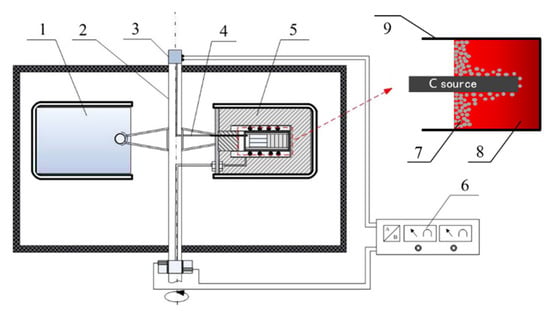 In this paper, a super-gravity field was introduced in the reaction of solid C particles in the Cu-Ti melt. The effect of the super-gravity field on the kinetics of the in situ reaction of solid C in the Cu-Ti alloy melt was experimentally verified. The sketch map of the super-gravity centrifuge used in the experiment is shown in Figure 4. In the experiment, 32 g of copper powder (25–75 μm) was mixed with 8 g of titanium powder (165–665 μm) in a graphite crucible as shown in Figure 5a, and then the graphite crucible was sealed with the graphite lid equipped with a graphite rod, before placing the set-up in the resistance furnace of the centrifugal device (Figure 4). The temperature was raised to 1250 °C at a heating rate of 10 °C/min, and the centrifuge was turned on after holding for 30 min. The centrifuge was maintained at a speed of N = 1892 rpm (gravity coefficient G = 1000 × g) for 30 min. After the test, the centrifuge and heating program were turned off, and the samples were taken out after cooling to room temperature. Comparative samples were prepared under normal gravity conditions (the remaining experimental conditions except for the gravity coefficient were the same as above). The longitudinal profile of the two samples from the center position is shown in Figure 5c,d.