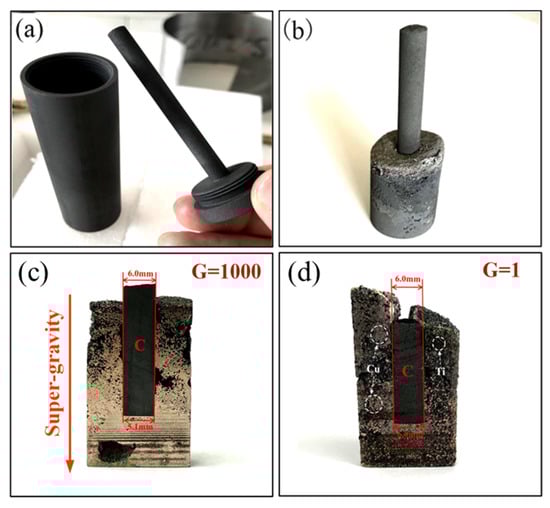 Comparison of the size change in solid C rods dissolved by Cu-Ti melt under normal gravity and super-gravity conditions (a) image of the designed graphite crucible; (b) the image of the sample after heating treatment; (c) the cross-section morphology of the sample after super-gravity treatment with G = 1000; (d) the cross-section morphology of the sample after heating in normal gravity.