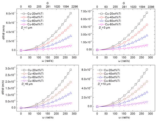 Then, according to Equation (54) and the data in Table 1, the moving velocity of TiCx particles in the Cu-Ti melt under the super-gravity field can be calculated as shown in Figure 6. It can be seen that the moving velocity of TiCx particles increases with the decrease in Ti content in the Cu-Ti melt, the increase in rotation velocity of the centrifugal apparatus, and the increase in particle diameter.