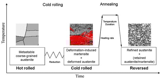 The reversion heat treatment for ASSs consisting of the cold rolling and annealing stages is schematically presented in Figure 1. A metastable ASS must first be cold worked to transform the austenite to DIM and deform it. There is often some hexagonal ε-martensite formed as well, but its fraction and contribution are minor in the reversion process, so that much attention has not been paid on that phase. Highly-deformed cell-type DIM is preferable for a source of a large number of nucleation sites for new austenite grains to attain the desired highly-refined GS in the subsequent reversion annealing [38,39,40]. If the total cold-rolling reduction is small, the transformation of austenite to DIM tends to remain partial and coarse-grained deformed austenite (DA) grains are retained in the structure. Furthermore, the lath-type, slightly deformed DIM reverses into austenite with coarser GS. Accordingly, very high cold rolling reductions of 90% to 95% were recommended originally and applied in numerous studies, e.g., [14,15,17,19,20,39,40], which can, however, be impractical in industry.