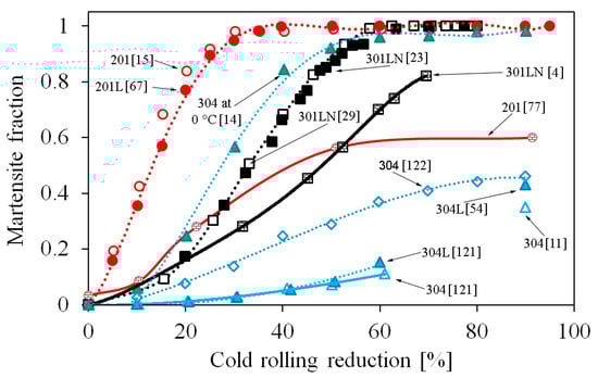 To give examples, the DIM fractions formed during cold rolling for some Cr-Mn and Cr-Ni ASSs (the exact chemical compositions are listed in Table 1; concentrations are always in mass %) are plotted as a function of the cold rolling thickness reduction in Figure 2. They show that in the 304/304L grade, only a small fraction of DIM can be obtained at RT [20,121]. After a 90% cold rolling reduction, Di Schino et al. [11] obtained 35% and Ravi Kumar et al. [54] 43% of DIM. However, at 0 °C, in experiments performed by Forouzan et al. [14], about 55% DIM was formed by a 30% cold rolling reduction in a 304 ASS (Md30 = 13 °C), and even a completely martensitic structure could be obtained after 60% reduction. In a 301LN ASS (Md30 ≈ 23–27 °C) in order to achieve a fully martensitic structure, a cold rolling reduction of about 60% is required [23,29,102], but for 201 and 201L grades, the reduction of 40% can be enough for that [15,16,67]. However, it must be noted that for this higher metastability of 201/201L ASSs, the nitrogen content must be low, for in experiments performed by Kisko et al. [28,83,101] and Hamada et al. [80] using the 201 grade with 0.052%C and 0.245%N, the DIM fraction obtained was only 30% after 60% cold rolling reduction. Hence, the exact chemical composition can greatly affect the mechanical stability which can vary within an ASS grade, requiring attention. As seen from Figure 2, if single pass reductions are high, adiabatic heating tends to reduce markedly the extent of DIM formed [4,77].