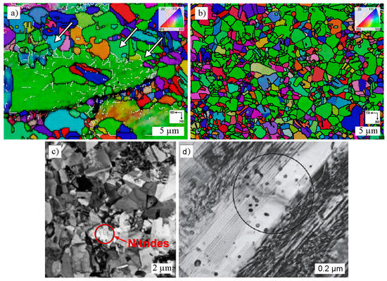 The reversion of α′-martensite (i.e., DIM) to austenite can occur by two different mechanisms, a diffusionless shear or diffusion-controlled one, as reported already in 1967 by Guy et al. [36]; see also [39,45]. Guy et al. observed that austenite with mechanical twins formed first from martensite in 18Cr-8Ni and 18Cr-12Ni steels, which then recovered to a subgrain structure. Concerning the GS refinement, both reversion mechanisms can readily lead to a micron-scale GS, though in principle the diffusional reversion is more efficient [38]. In Fe-Cr-Ni ternary alloys, in the first stage, the shear phase reversion results in austenite which contains traces of prior α′-martensite morphology, the same grain boundaries as those of original austenite and a high density of defects. After the fast transformation, defect-free austenite subgrains are formed which coalesce to a structure resembling recrystallized structure [38,39]. An example of the formation of dislocation free grains from subgrains is shown in Figure 3a. On the contrary, the diffusional reversion is characterized by the nucleation and growth of randomly oriented equiaxed austenite grains; the result is shown in Figure 3b. The nucleation occurs on the cell or lath boundaries of the deformed DIM, and austenitic grains grow in size with time but can stay in a nanometer or submicron range. Secondary phase precipitates can also form in the course of the reversion, for instance nano-size chromium nitrides in 301LN [22,26,89] (Figure 3c,d) and carbides in 301 [130,134,135].