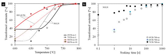 Somani et al. [23,80], Kisko et al. [27,28,81,82,83] and Järvenpää et al. [84,85,86,87] have used a high heating rate of 200 °C/s in their experiments. They found that in 301LN (Ni/Cr ≈ 0.4), the diffusion-controlled reversion started, depending on prior cold rolling reduction, around 650–700 °C and was completed within few seconds at 750–800 °C. Examples of the influence of cold rolling degree on the reversion kinetics in a 301LN ASS are illustrated in Figure 4, where also the data of Takaki et al. [40] for an 18Cr-8.5Ni steel is included. A higher reduction results in faster reversion. The diffusional reversion is fast at 750 °C and above in both steels being completed within 100 s even after 45% cold rolling reduction.