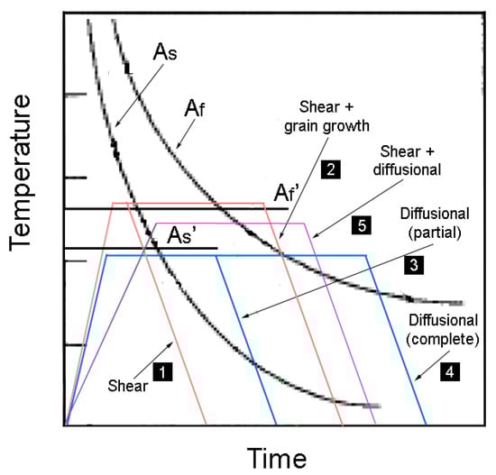 On the other hand, the As and Af temperatures for the diffusional reversion depend on the heating rate in addition to the chemical composition of the steel (Figure 5). The effect of heating rate was already investigated in Fe-Ni-C alloys by Apple and Krauss [141] in 1972. In isothermal annealing, the diffusional reversion proceeds more rapidly with increasing annealing temperature, and the Af temperature depends on soaking time, as seen from the As and Af curves. The reversion annealing routes 3, 4 and 5 are possible, and a short holding (route 3) below As′ would result in partial reversion and a sufficiently long holding (route 4) to complete reversion. A slow heating to the As′–Af’ regime means the initiation of shear reversion which might be completed by the diffusional reversion (route 5) or some DIM remains stable.