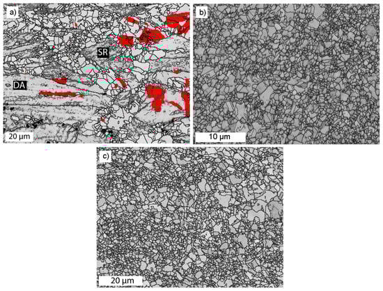 Examples of reversed microstructures in 301LN with various grain size. Partially reversed (32% cold rolling, 750 °C for 0.1 s) with shear reversed (SR) fine and medium-size grains, a large DA grain and retained DIM (red colored phase) (a) and diffusionally reversed ultrafine and medium-size grains in 63% cold-rolled steel, annealed at 800 °C for 1 s (b) and at 900 °C for 1 s (c).