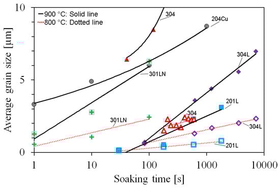 Grain growth of reversed grain size at 800 and 900 °C in 201L [67], 204Cu [82], 301LN [26], 304L [17,70] and 304 [11] ASSs.