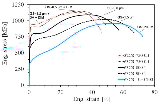 Examples of engineering tensile stress–strain curves for a 301LN ASS with refined grain size after various reversion treatments. Data collected from References [87,102,103]. Legend: Reduction (%CR), temperature (°C), duration (s).