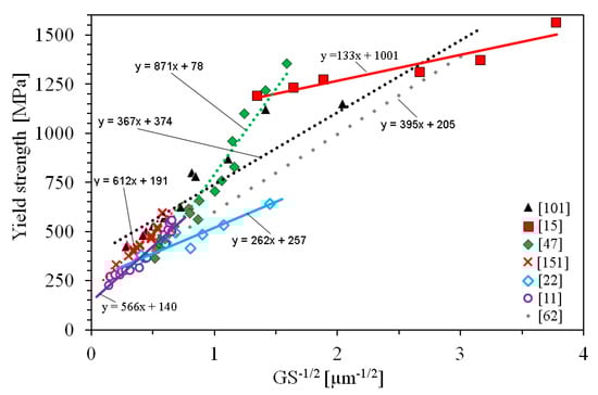 Examples of the Hall–Petch relations presented for reversed structures. Data for annealed coarse-grained 301LN is included from [151].