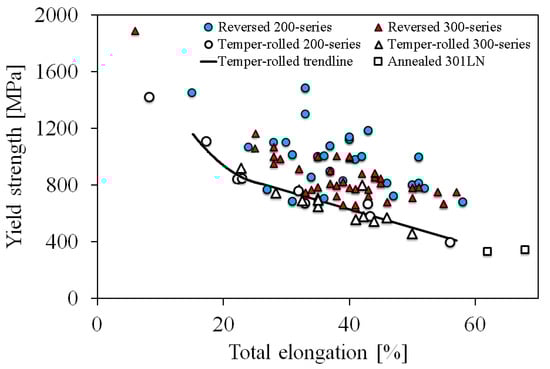 From the data in Table 2, a general conclusion can be drawn that no distinct difference exists between the Cr-Ni and Cr-Mn type grades, and same temperatures between 650–900 °C and holding times 1–1800 s are feasible for the reversion. It seems that the YS (proof stress, Rp0.2) values reported for 201/201L ASSs can be well above 1000 MPa, even up to 1485 MPa [16], but in those instances severe cold rolling reductions of 90% to 95% have been applied to obtain the GS of an order of 60–100 nm. However, the 60% cold rolling of 201 with 0.23%N [80] similarly as 204Cu and 204Cu-0.45Nb [83] can result in YS of 1.1 GPa, while TE is still about 40%.