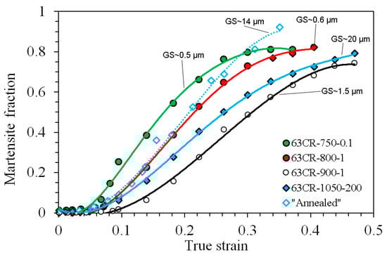 In ultrafine-grained austenite, no shear bands are formed, but martensite nucleates on grain boundaries [75,81,102], so that the basis of the OC-model could be doubted. However, sigmodal shapes of DIM fraction vs strain have still been recorded (as seen in Figure 11). Marechal [75] even fitted his tensile data with the OC-model and determined the values of the parameters and their GS dependence, down to 0.5 μm GS. However, it is hard to draw any conclusions from the varying values of all the parameters.