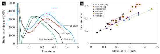 The evident fact is that the TS cannot be increased so significantly as the YS, only about 200 MPa to reach the level of 1100 MPa in most cases. This is due to somewhat lower strain hardening rate (SHR) owing to finer GS generally increasing the austenite stability and shorter elongation in reversed fine-grained structures (Figure 8).