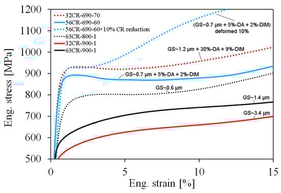 A principal target of the reversion treatment is to increase YS of an ASS without impairing its high elongation. An example of typical results is illustrated in Figure 8, where a set of engineering stress–strain curves are plotted for a 301LN ASS showing how significantly YS is increased by refined GS as a result of reversion treatments. Moreover, the tensile strength (TS) is improved while TE is decreased. Certain typical changes, a yield point and a concave shape, appear in the flow curves, to be discussed later.