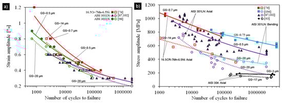 Grain size (GS) refinement is an effective method for increasing the static strength properties of metals and alloys (the Hall–Petch relationship) and also their fatigue performance, especially in the high-cycle fatigue (HCF) regime. The GS of commercial ASSs is typically larger than 10 µm. Even though the impact of GS on strength is not so high in ASSs as in ferritic steels, it has been shown in a large number of papers that the refinement of GS can provide significant improvement in the YS of austenite, e.g., [10,11,12,13,14,15,16,17,18,19,20,21,22,23,24,25,26,27,28,29]. The traditional hot rolling process or cold rolling and recrystallization annealing are not effective for refining the GS of the austenite phase, although GS of 2 µm has been obtained by using warm rolling and annealing [30]. The role of dynamic recrystallization in GS refinement in ASSs has been reviewed by Zhao and Jiang [31], but it is not very efficient due to high temperatures required. However, the reversion treatment, in which deformation-induced α′-martensite (DIM) transforms back to austenite has been shown to refine the austenite GS to submicron size, resulting in excellent combinations of YS and tensile elongation (TE), as reported in numerous studies during the last 30 years.