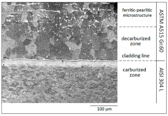 The interface between base and clad material is represented by a thin, but clearly identifiable, line that follows the ferritic grains profile, as shown by the SEM micrograph in Figure 1. In agreement with the investigations carried out in literature [5,13], at the carbon steel side, close to the cladding material, we found a decarburized zone with a thickness of about 120 μm, consisting of coarse ferritic grains (30–50 μm); away from the cladding line, it is observable the typical rolling microstructure, with pearlitic grains being aligned according to parallel bands.