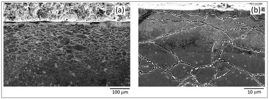 In the zone that was affected by carbide precipitation, chromium depletion near the grain boundaries results in the austenite sensitization to the intercrystalline corrosion, as highlighted by the micrograph in Figure 7 that was taken after having carried out the ASTM Test A262-Practice E (the box with the higher magnification highlights the corrosion effects in a zone immediately close to the cladding line). Anyway, the thickness of the sensitized zone is very much lower than that of the cladding layer.