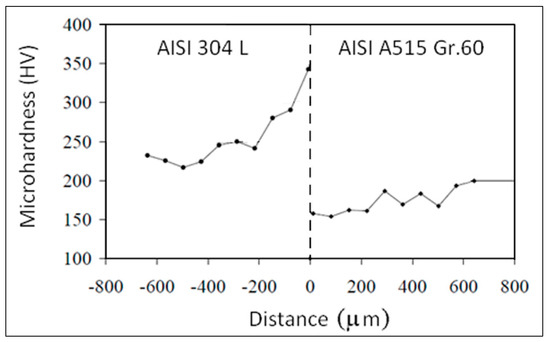 The results of Vickers microhardness test along a transversal line to the interface ASTM A515 Gr.60/AISI 304 L.