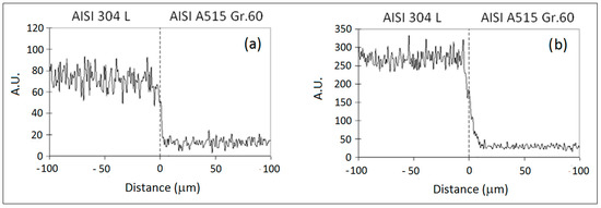 Results of energy dispersive spectroscopy (EDS) measurements along a line orthogonal to the interface ASTM A515 Gr.60/AISI 304 L. Concentration profiles according to the distance from the initial interface: (a) Ni, (b) Cr.