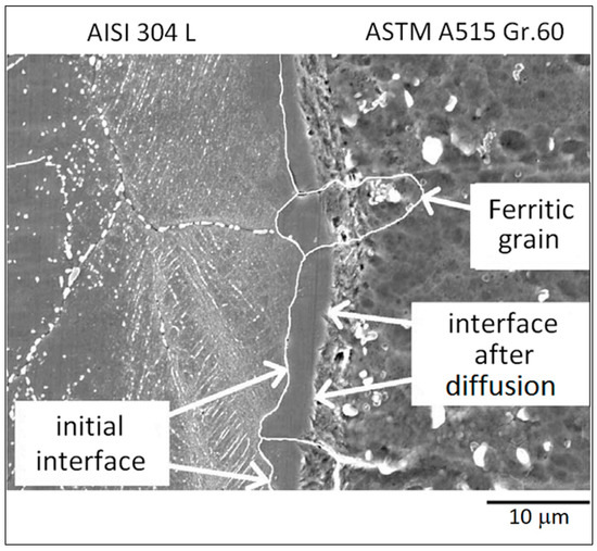 Moreover, our observations lead to considering that a backing of the ferritic phase from its initial position occurred, which was caused by diffusion of the substitution elements. In fact, following the boundaries of the ferric grains, it is possible to outline, in white, the initial position of the interface, while its position after diffusion appears to be translated of some microns towards the base steel.