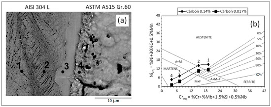 Therefore, we addressed our experiments to characterize the phases in the zone that were crossed by the interface displacement: punctual EDS measurements were performed across this zone (Figure 6a) and the obtained compositions are reported on the WRC-92 diagram [27,28] (Figure 6b).