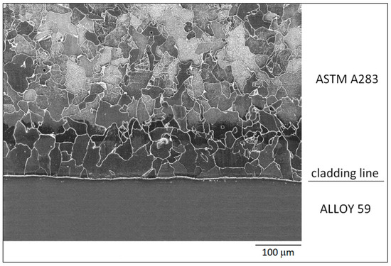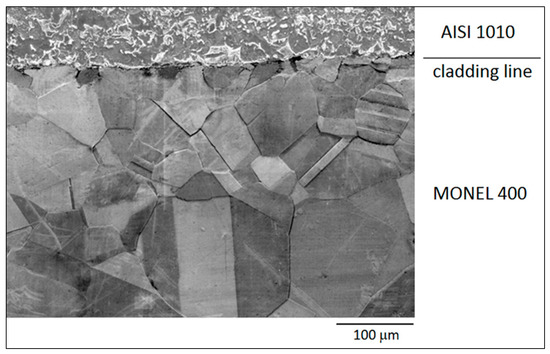 The interface is represented by a thin but clear line, which follows the boundaries of the ferritic-pearlitic grains, as in the previous cases (Figure 12). The base steel shows the typical rolling microstructure, without evidence of decarburization phenomena; in a zone that is close to the cladding line, for a width of about 200 μm, the Monel alloy is characterized by non-recrystallized grains of small size.