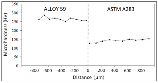 The results of Vickers microhardness test along a transversal line to the interface ASTM A283/Alloy59.