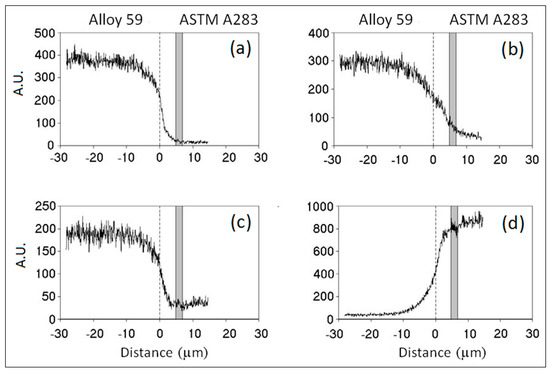 Results of EDS measurements along a line orthogonal to the interface ASTM A2830/Alloy 59. Concentration profiles vs. the distance from the initial interface: (a) Ni; (b) Cr; (c) Mo; and, (d) Fe.