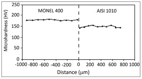Results of Vickers microhardness test along a line orthogonal to the interface AISI 1010/Monel 400.