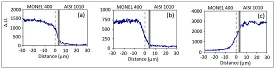 Results of EDS measurements along a line orthogonal to the interface AISI 1010/Monel 400. Concentration profiles: (a) Ni; (b) Cr; (c) Fe.