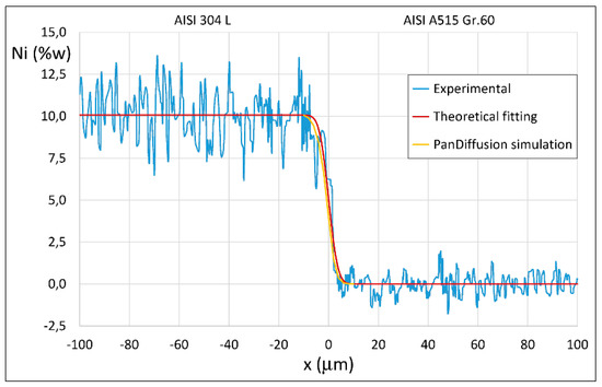 The experimental profiles of the solute atoms across the bimetallic interfaces have been fitted by the procedure that is reported in the previous Section 2.2. Equation (1) characterizes the element transport controlled by solid state diffusion according to the Fick’s second law, so it expresses the theoretical concentration profiles. Assuming that the diffusivity does not change with concentration, it is possible to calculate the D∙t parameter in Equation (1) that gives a good fit of the EDS experimental profiles, as shown in Figure 15 for Ni diffusion at the interface ASTM A515 Gr.60/AISI 304 L.